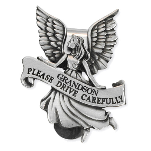 This genuine pewter guardian angel visor clip for grandsons is sold in packs of two. Reads: Grandson please drive carefully. Individually carded.