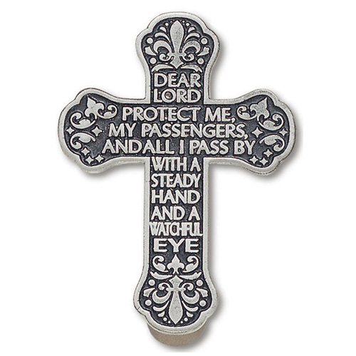 This pewter motorist's prayer cross visor clip is sold in packs of two. Inscription: Dear Lord Protect me, my passengers, and all I pass by with a steady hand and a watchful eye. Individually carded. Budded cross. Item size: 1.75in x 2.5in.
