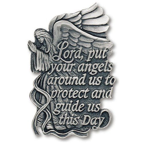 Genuine pewter guardian angel car visor clip is sold in packs of two. Inscription: Lord, put your angels around us to protect and guide us this Day. Individually carded.