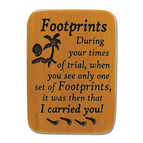 This genuine mahogany wood visor clip set of two is carved and laser cut. Visor clip size: 1 1/2in by 2in. Reads: Footprints, During your times of trial, when you see only one set of Footprints, it was then that I carried you! Individually carded.