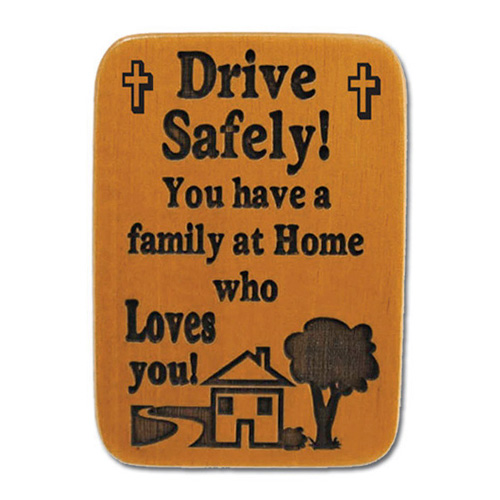 This genuine mahogany wood visor clip is carved and laser cut. Measures 1 1/2 inches by 2 inches. Individually carded. Sold in a set of two. Reads: Drive Safely! You have a family at Home who Loves you!