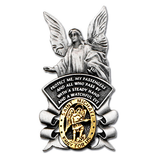 This genuine pewter visor clip guardian angel features a gold plated Saint Michael medal. Individually carded. Sold in a set of two. Reads: Protect me, my passengers, and all who pass by with a steady hand and a watchful eye.