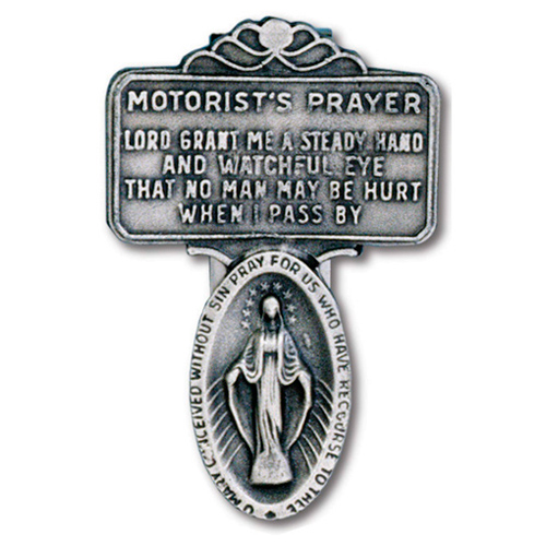 This genuine pewter visor clip miraculous medal features the motorist's prayer. Individually carded. Sold in a set of two. Reads: Lord grant me a steady hand and a watchful eye, that no man be hurt when I pass by.