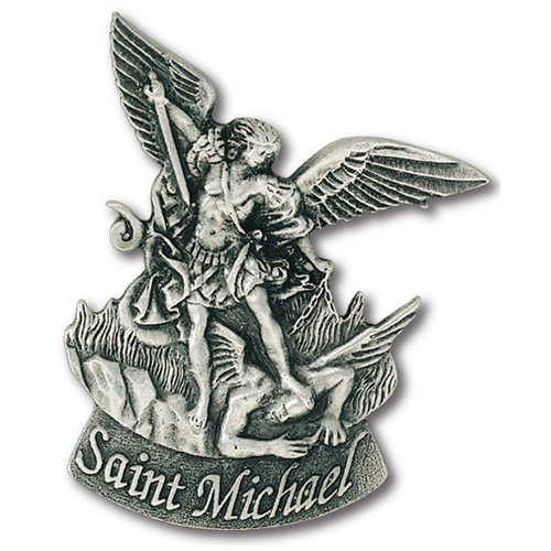 This pewter finish visor clip features Saint Michael slaying the devil. Individually carded. Sold in a set of two.