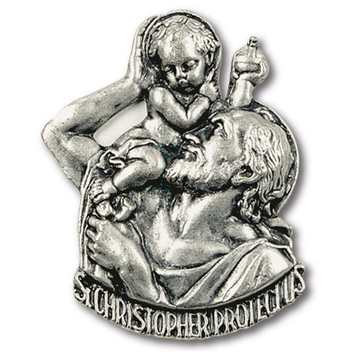 This genuine pewter visor clip features Saint Christopher. Individually carded. Sold in a set of two. Reads: St. Christopher Protect Us.