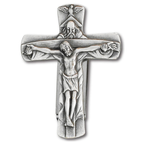 This genuine pewter visor clip features a Father, Son and Holy Ghost Trinity cross. Individually carded. Sold in a set of two.