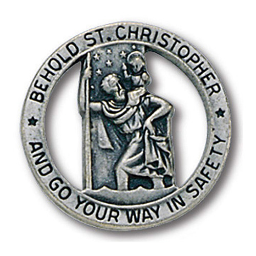 This genuine pewter visor clip features a round Saint Christopher medal. Individually carded. Sold in a set of two. Reads: Behold St. Christopher and go your way in safety.