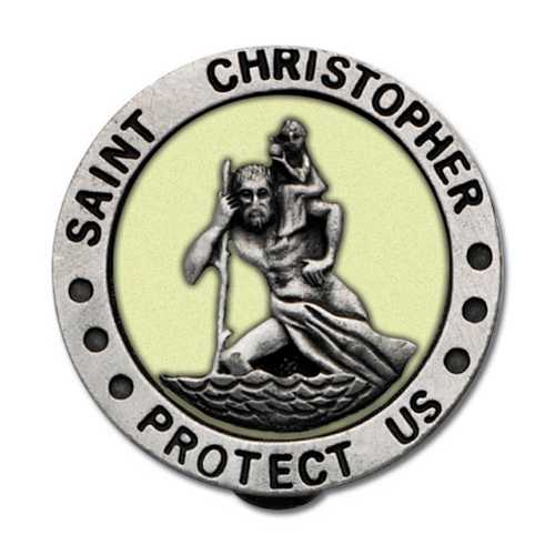 This pewter finish visor clip features a round Saint Christopher medal which glows in the dark. Individually carded. Sold in a set of two. Reads: St. Christopher Protect Us.
