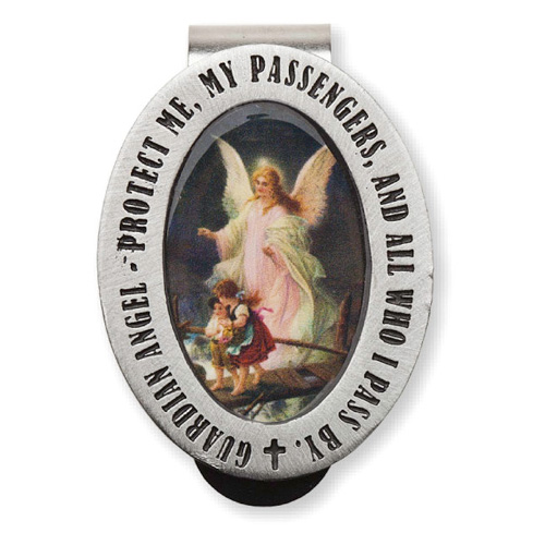 This genuine pewter guardian angel enameled visor clip is sold in packs of two. Reads: Guardian angel Protect me, my passengers, and all who I pass by. Individually carded. Sold in packs of two.