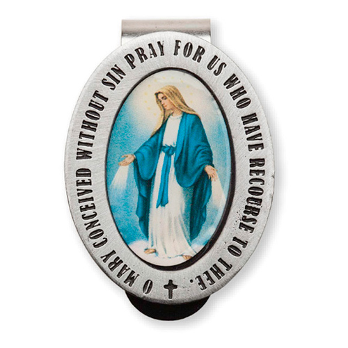 This genuine pewter miraculous medal enameled visor clip is sold in packs of two. Reads: O Mary conceived without sin pray for us who have recourse to thee. Individually carded. Sold in packs of two.