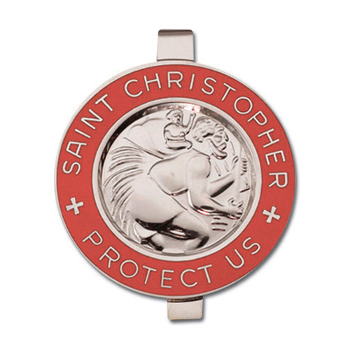 This genuine silver plated pewter Saint Christopher medal is hand enameled with red enamel. Reads: Saint Christopher Protect Us. Individually carded. Sold in packs of two.