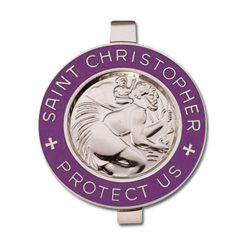 This genuine silver plated pewter Saint Christopher medal is hand enameled with purple enamel. Reads: Saint Christopher Protect Us. Individually carded. Sold in packs of two.
