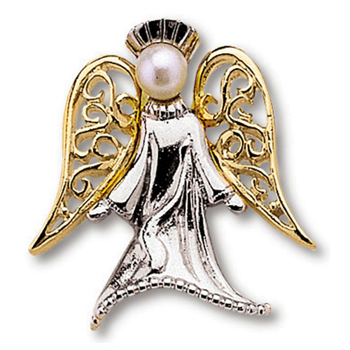 This genuine gold and silver plated pearl angel pin is sold in packs of two. Pin size: 1 inch x 1 inch. Individually carded.