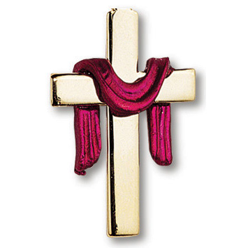 This gold plated red draped robe cross pin is sold in packs of two. Individually carded.