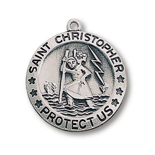 This men's round sterling silver Saint Christopher medal comes on a heavy weight 24 inch stainless steel chain. Medal measures 13/16 inch round. Deluxe gift boxed.