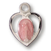 This stering silver pink enamel miraculous medal necklace comes on a light weight 18 inch silver chain. Deluxe gift boxed. Heart shaped medal measures 3/8 inch tall.