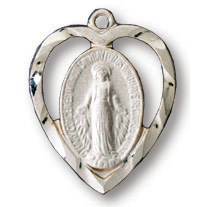 This very small stering silver miraculous medal pendant comes on a light weight 18 inch silver chain. Heart shaped medal measures 9/16 inch tall. Deluxe gift boxed.