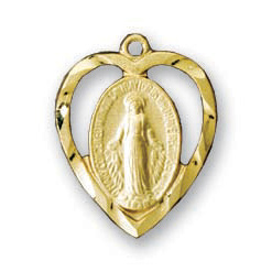 This 18kt yellow gold over stering silver miraculous heart medal necklace comes on a light weight 18 inch gold plated chain. Deluxe gift boxed. Heart shaped medal measures 9/16 inch tall.