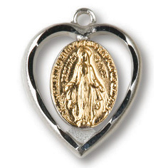 This 18kt yellow gold over stering silver miraculous heart medal necklace comes on a light weight 18 inch silver chain. Deluxe gift boxed. Heart shaped medal measures 5/8 inch tall.