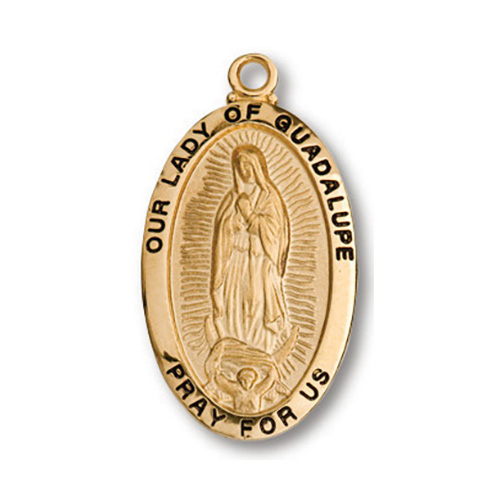 This 18kt yellow gold over stering silver Our Lady of Guadalupe medal necklace comes on a light weight 18 inch gold plated chain. Deluxe gift boxed. Oval shaped medal measures 5/8 inch tall.