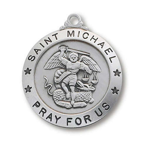 This genuine stering silver Saint Michael medal necklace comes on a heavy weight 24 inch stainless steel chain. Deluxe gift boxed. Round medal measures 7/8 inches tall.