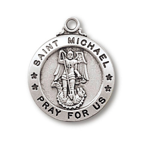 This genuine stering silver Saint Michael medal necklace comes on a medium weight 18 inch stainless steel chain. Deluxe gift boxed. Round medal measures 3/4 inches tall.