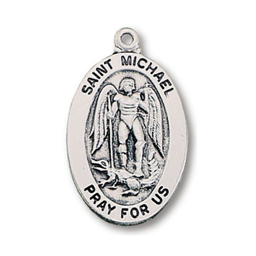 This genuine stering silver Saint Michael medal comes on a medium weight 18 inch stainless steel chain. Deluxe gift boxed. Oval medal measures 7/8 inch tall.
