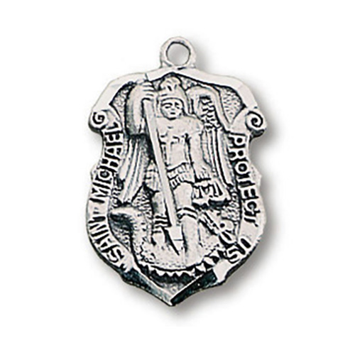 This genuine stering silver Saint Michael police shield medal comes on a light weight 18 inch silver chain. Deluxe gift boxed. Medal measures 3/4 inch tall.
