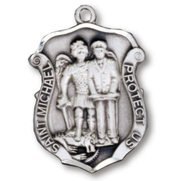 This genuine sterling silver Saint Michael police shield medal comes on a heavy weight 24in stainless steel chain. Deluxe gift boxed. Medal measures 1 inch tall.