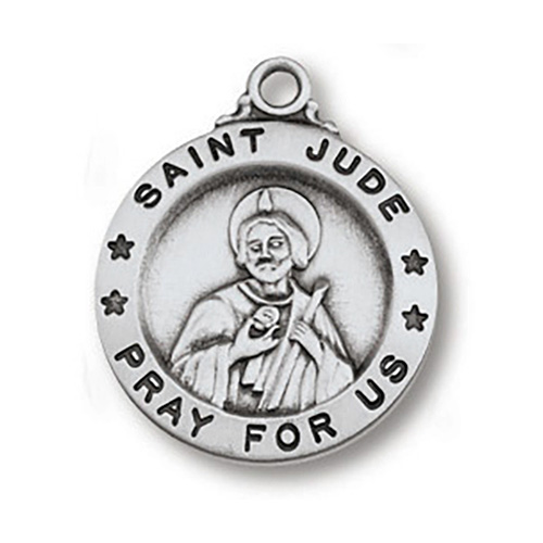 This genuine stering silver Saint Jude medal necklace comes on a light weight 18 inch silver chain. Deluxe gift boxed. Round medal measures 5/8 inches tall.