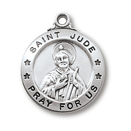 This round sterling silver Saint Jude medal necklace comes with a medium weight 18in stainless steel chain. This medal measures 3/4 inches tall. Deluxe gift boxed. Import.
