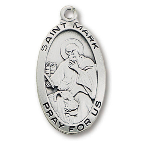 This genuine stering silver Saint Mark medal comes on a heavy weight 24 inch stainless steel chain. Deluxe gift boxed. Oval medal measures 1 inch tall.