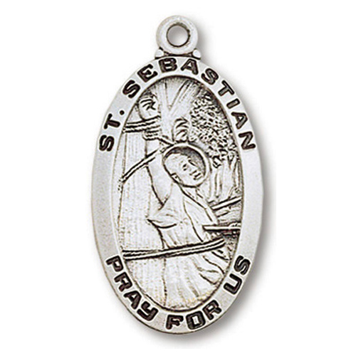 This genuine stering silver Saint Sebastian medal comes on a heavy weight 24 inch stainless steel chain. Deluxe gift boxed. Oval medal measures 1 inch tall.