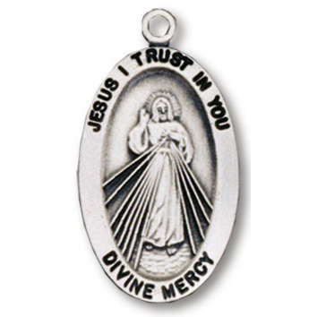 This genuine stering silver Divine Mercy medal necklace comes on a medium weight 18 inch stainless steel chain. Deluxe gift boxed. Oval medal measures 15/16 inches tall.