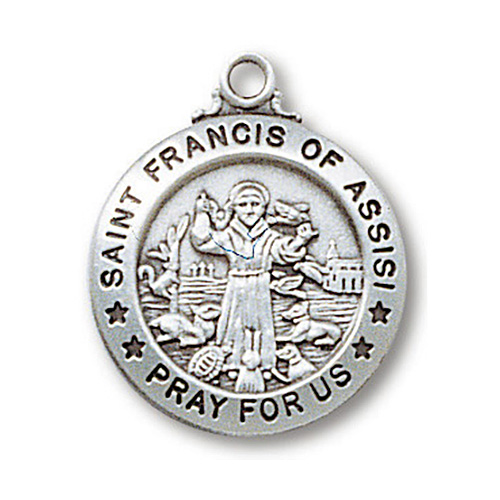 This round Saint Francis of Assisi medal is made of sterling silver and comes on a medium weight 18 inch stainless steel chain. It depicts St Francis with various animals. Deluxe gift boxed. Medal measures 3/4 inches tall.