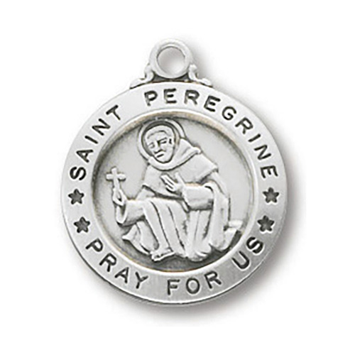 This small round sterling silver Saint Peregrine medal comes on a light weight 18 inch silver chain. Round medal measures 5/8 inches tall. This item is slightly smaller than a dime. Deluxe gift boxed.