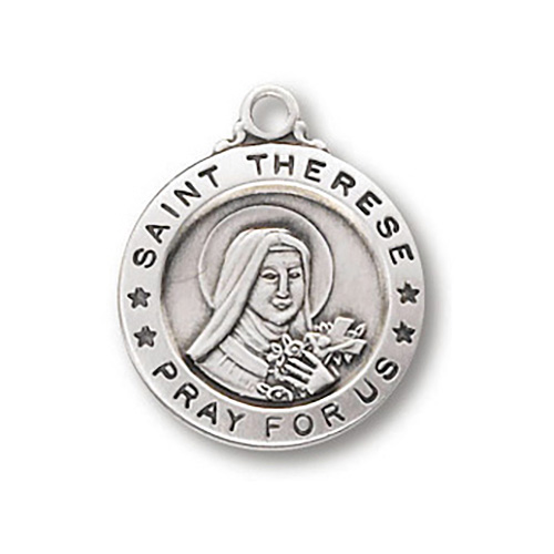 This genuine stering silver Saint Therese medal necklace comes on a light weight 18 inch silver chain. Deluxe gift boxed. Round medal measures 5/8 inches tall.