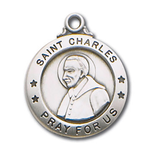This genuine stering silver Saint Charles medal necklace comes on a medium weight 18 inch stainless steel chain. Deluxe gift boxed. Round medal measures 3/4 inches tall.