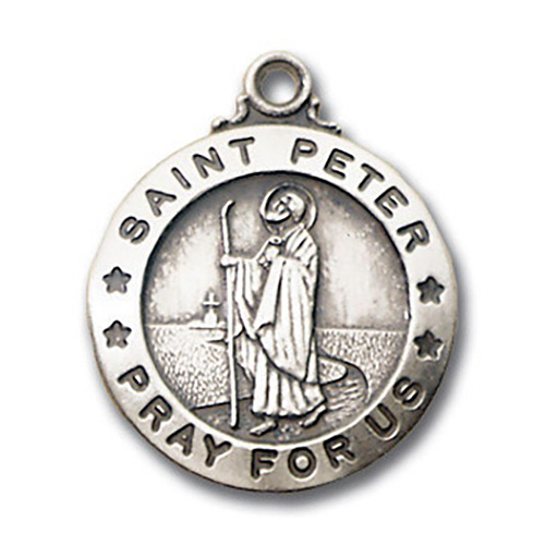 This genuine stering silver Saint Peter medal necklace comes on a medium weight 18 inch stainless steel chain. Deluxe gift boxed. Round medal measures 3/4 inches tall.