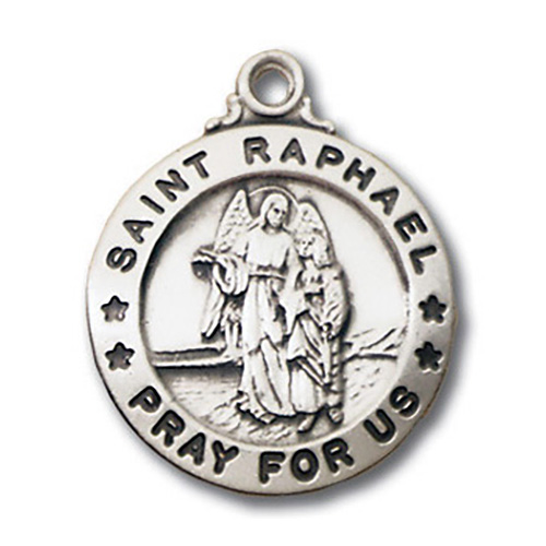 This genuine stering silver Saint Raphael medal necklace comes on a medium weight 18 inch stainless steel chain. Deluxe gift boxed. Round medal measures 3/4 inches tall. Made in the USA.