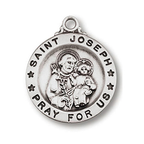 This genuine stering silver Saint Joseph medal necklace comes on a light weight 18 inch silver chain. Deluxe gift boxed. Round medal measures 5/8 inches tall.
