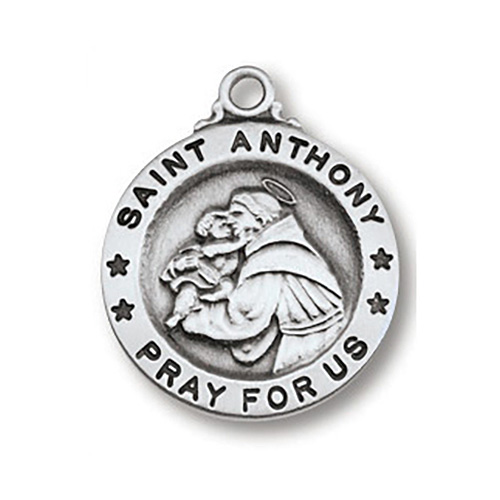 This small round sterling silver Saint Anhtony medal comes on a light weight 18 inch silver chain. Medal measures 5/8 inches tall. Deluxe gift boxed.