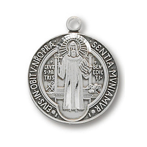 This ladies' sterling silver Saint Benedict medal comes on a light weight 18in sterling silver chain. Latin Inscription: EIVS IN OBITV NRO PRAESENTIA MVNIAMVR. This means may his presence protect us in the hour of death. Round medal measures 5/8 inches tall. Deluxe gift boxed.