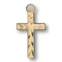 This genuine 14kt yellow gold filled scalloped cut cross comes on a light weight 18 inch gold plated chain. Deluxe gift boxed. Cross measures 1/2 inch tall.