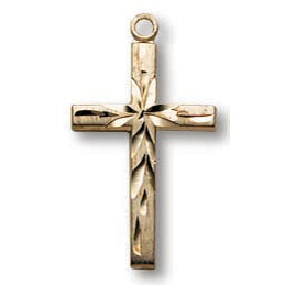 This genuine 14kt yellow gold filled scalloped cut cross comes on a light weight 18 inch gold plated chain. Deluxe gift boxed. Cross measures 11/16 inch tall.