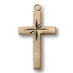 This genuine 14kt yellow gold filled cross comes on a light weight 18 inch gold plated chain. Deluxe gift boxed. Cross measures 11/16 inch tall. Cross features a scalloped cut out burst in the center.