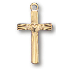 This genuine 14kt yellow gold filled heart centered cross comes on a light weight 18 inch gold plated chain. Deluxe gift boxed. Cross measures 5/8 inch tall. Cross features a heart shape in the center and scalloped rays of light.