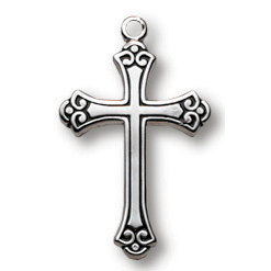 This genuine sterling silver budded cross comes on a light weight 18 inch silver chain. Deluxe gift boxed. Cross measures 11/16 inch tall. Cross features antiqued budded tips.