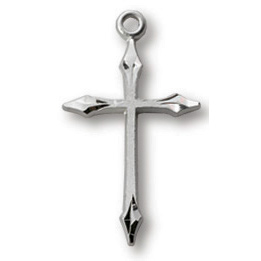 This genuine sterling silver passion cross comes on a light weight 18 inch silver chain. Deluxe gift boxed. Cross measures 11/16 inch tall. Cross features beveled tips.