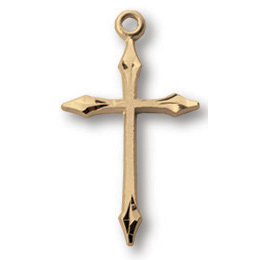 This genuine 14kt yellow gold filled passion cross comes on a light weight 18 inch gold plated chain. Deluxe gift boxed. Cross measures 11/16 inch tall. Cross features beveled tips.